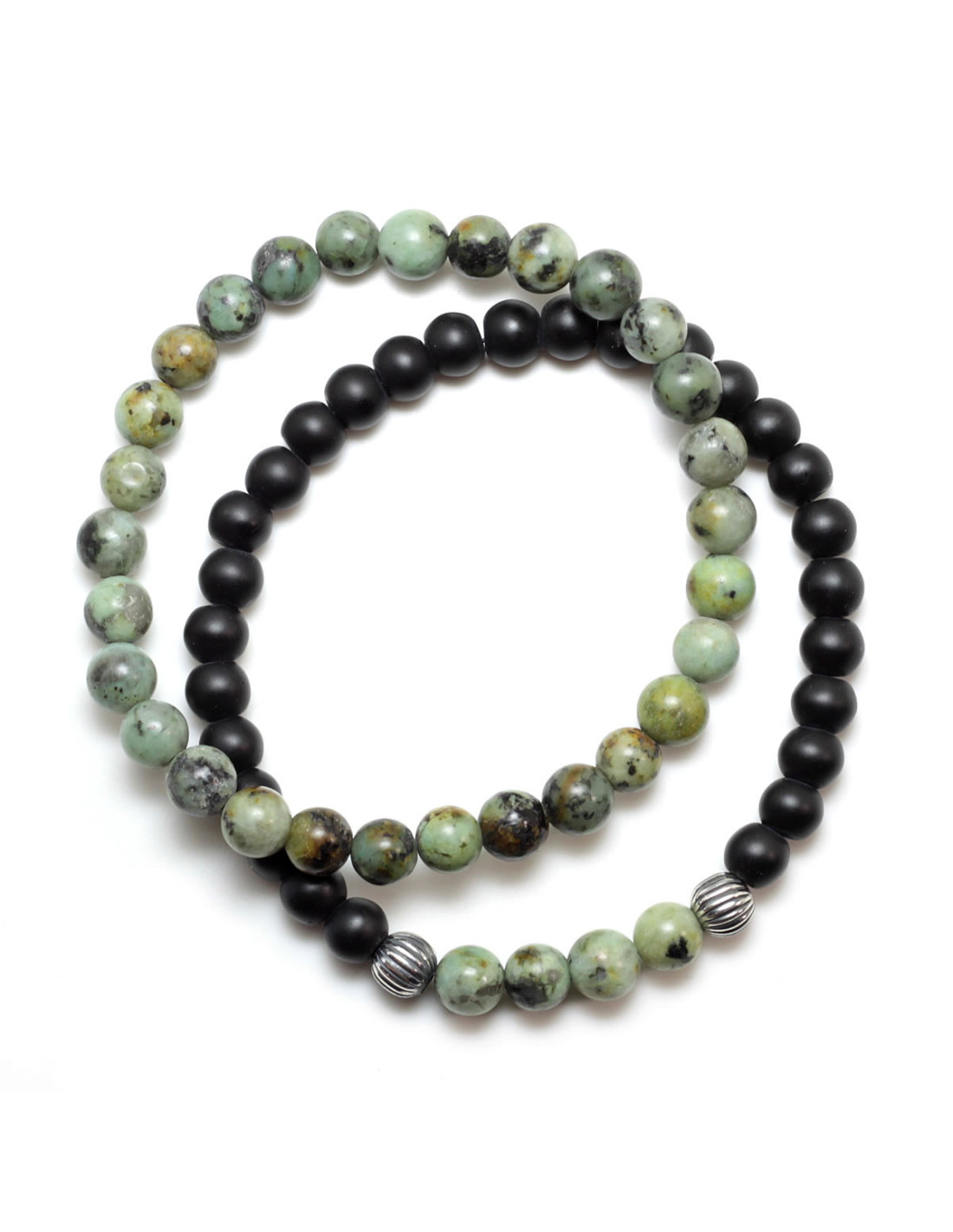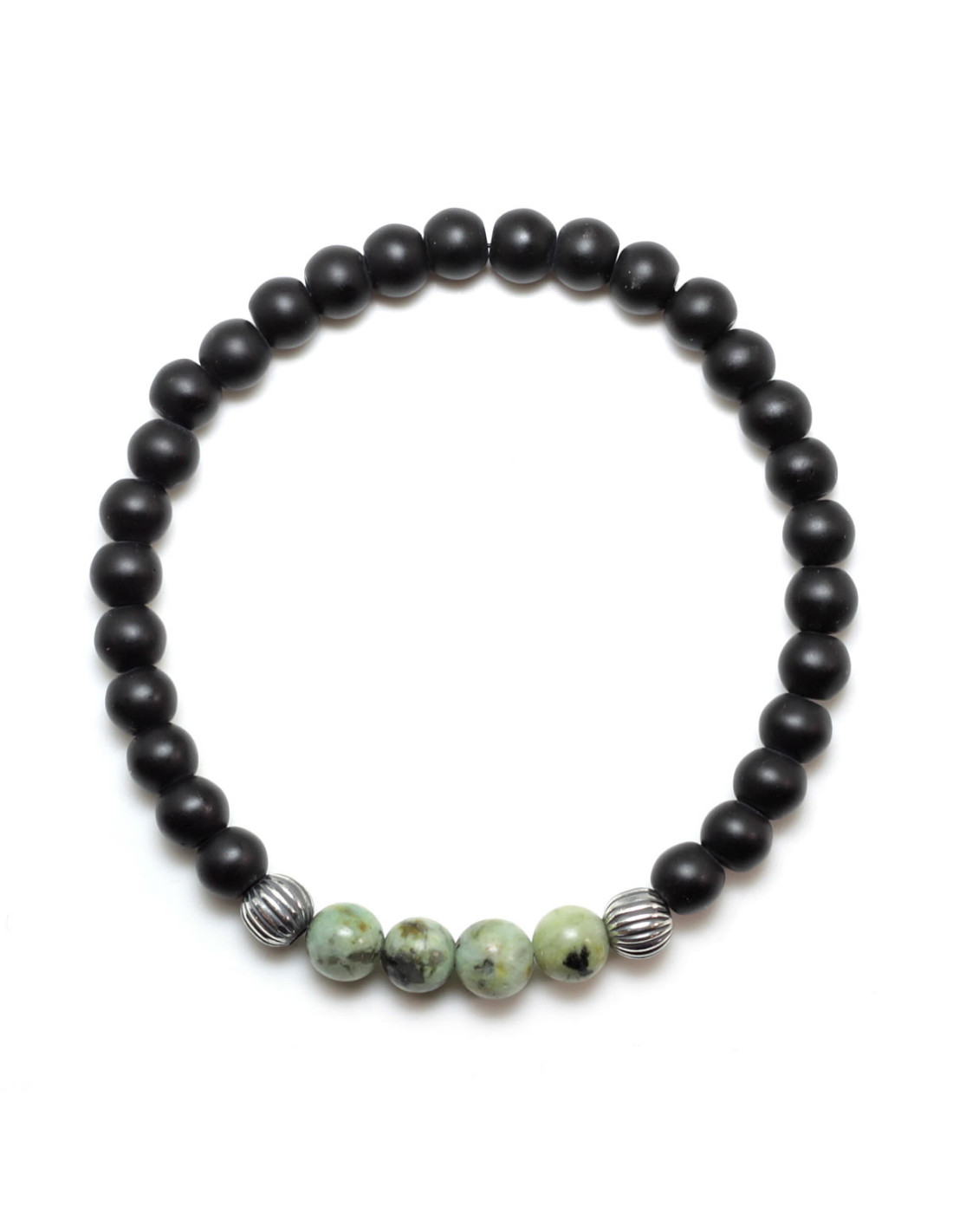 Bransoletka na elastycznej gumce jubilerskiej wykonana z naturalnego, matowego onyksu, turkusu afrykańskiego oraz ozdobnych elementów ze srebra próby 925, dodatkowo oksydowanych dla podkreślenia jej męskiego charakteru.