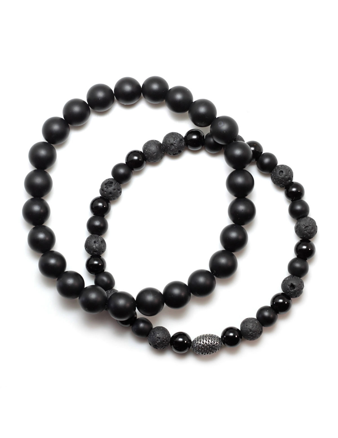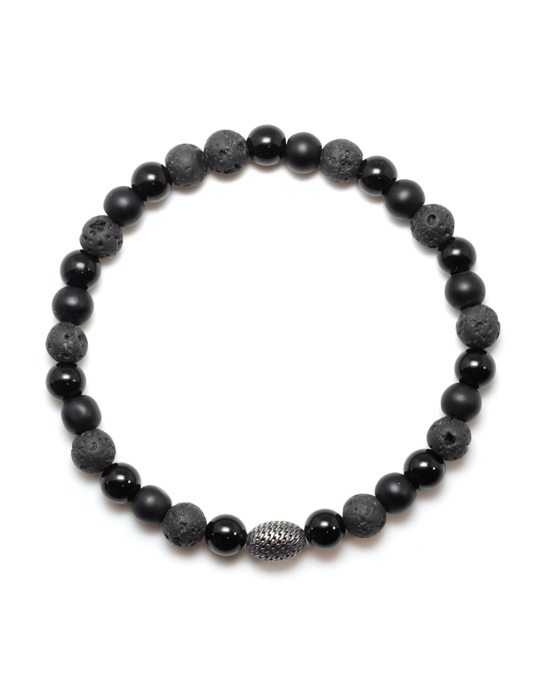 Elegancka bransoletka na elastycznej gumce jubilerskiej. Wykonana z naturalnych kamieni w monochromatycznej tonacji o zróżnicowanej fakturze: matowych lub polerowanych onyksów oraz porowatej lawy wulkanicznej. Dodatkowo ozdobiona jest ażurową zawieszką z oksydowanego srebra. Całość tworzy bardzo ciekawy i stylowy efekt.