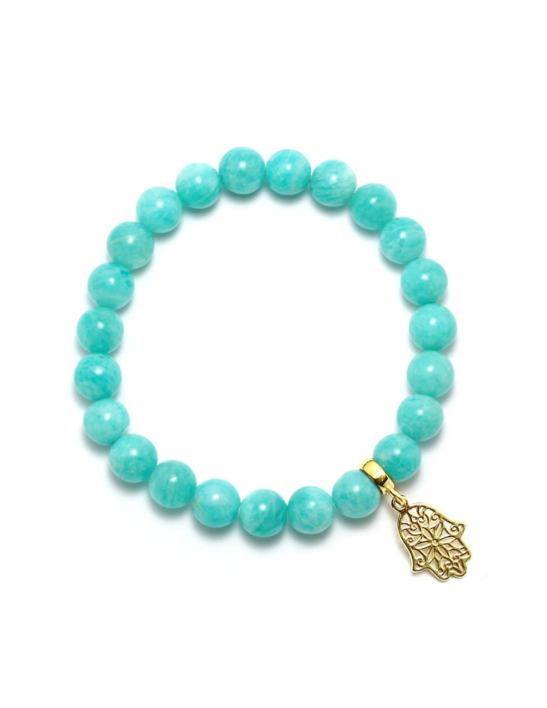 Bransoletka na elastycznej gumce jubilerskiej wykonana z naturalnego, wysokiej klasy amazonitu o intensywnej turkusowej barwie oraz pozłacanej 24-karatowym złotem srebrnej zawieszki w kształcie hamsy- symbolu szczęścia, zdrowia i ochrony (dla uzyskania trwalszej powłoki element pokrywany jest 2 warstwami złota). Istnieje możliwość zamówienia innego rozmiaru niż podany w opisie.