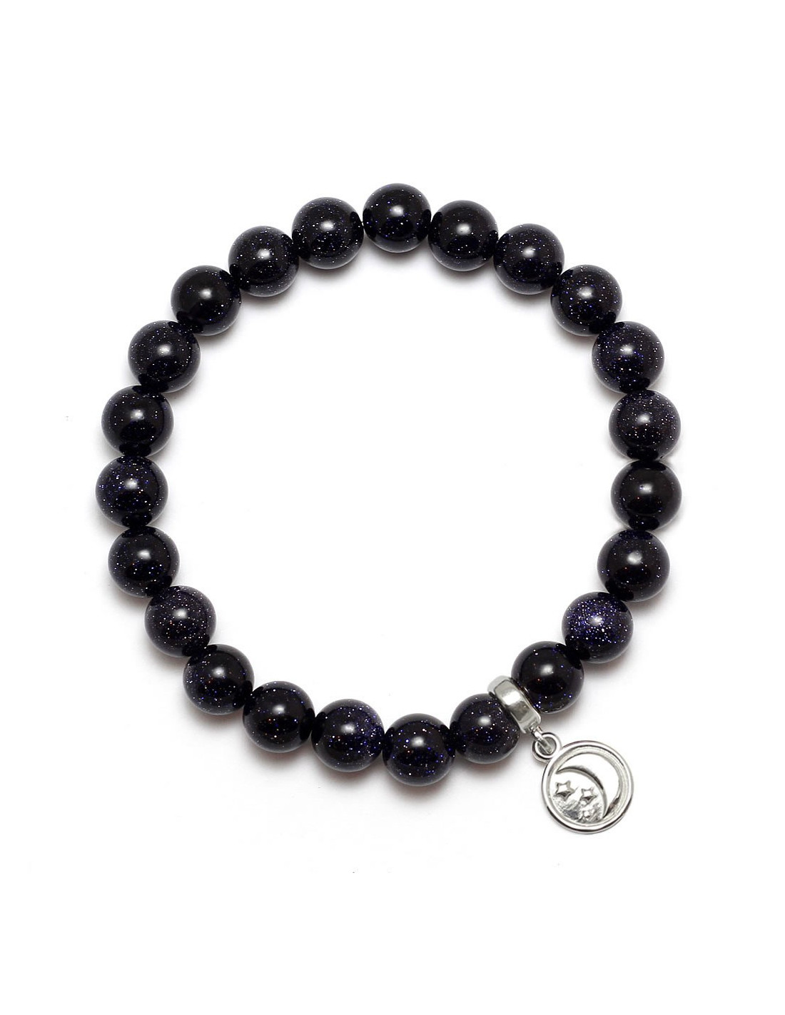 Bransoletka na elastycznej gumce jubilerskiej wykonana z kamienia o nazwie Noc Kairu oraz srebrnej zawieszki z wizerunkiem księżyca - symbolem kobiecej siły, świata snów i pragnień. Noc Kairu to granatowa odmiana szkła awenturynowego z charakterystycznym efektem skrzenia, za który odpowiadają drobinki innych metali, np. opiłki żelaza. Istnieje możliwość zamówienia innego rozmiaru niż podany w opisie.