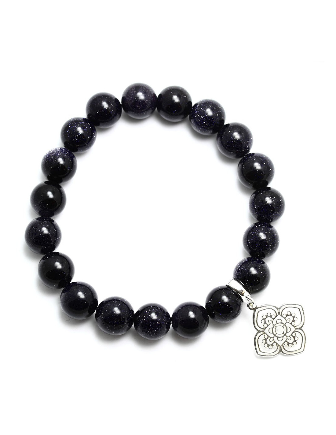 Bransoletka na elastycznej gumce jubilerskiej wykonana z kamienia o nazwie Noc Kairu oraz srebrnej zawieszki w kształcie kwiatu lotosu - symbolu piękna, czystości i doskonałości. Noc Kairu to granatowa odmiana szkła awenturynowego z charakterystycznym efektem skrzenia, za który odpowiadają drobinki innych metali, np. opiłki żelaza. Istnieje możliwość zamówienia innego rozmiaru niż podany w opisie.