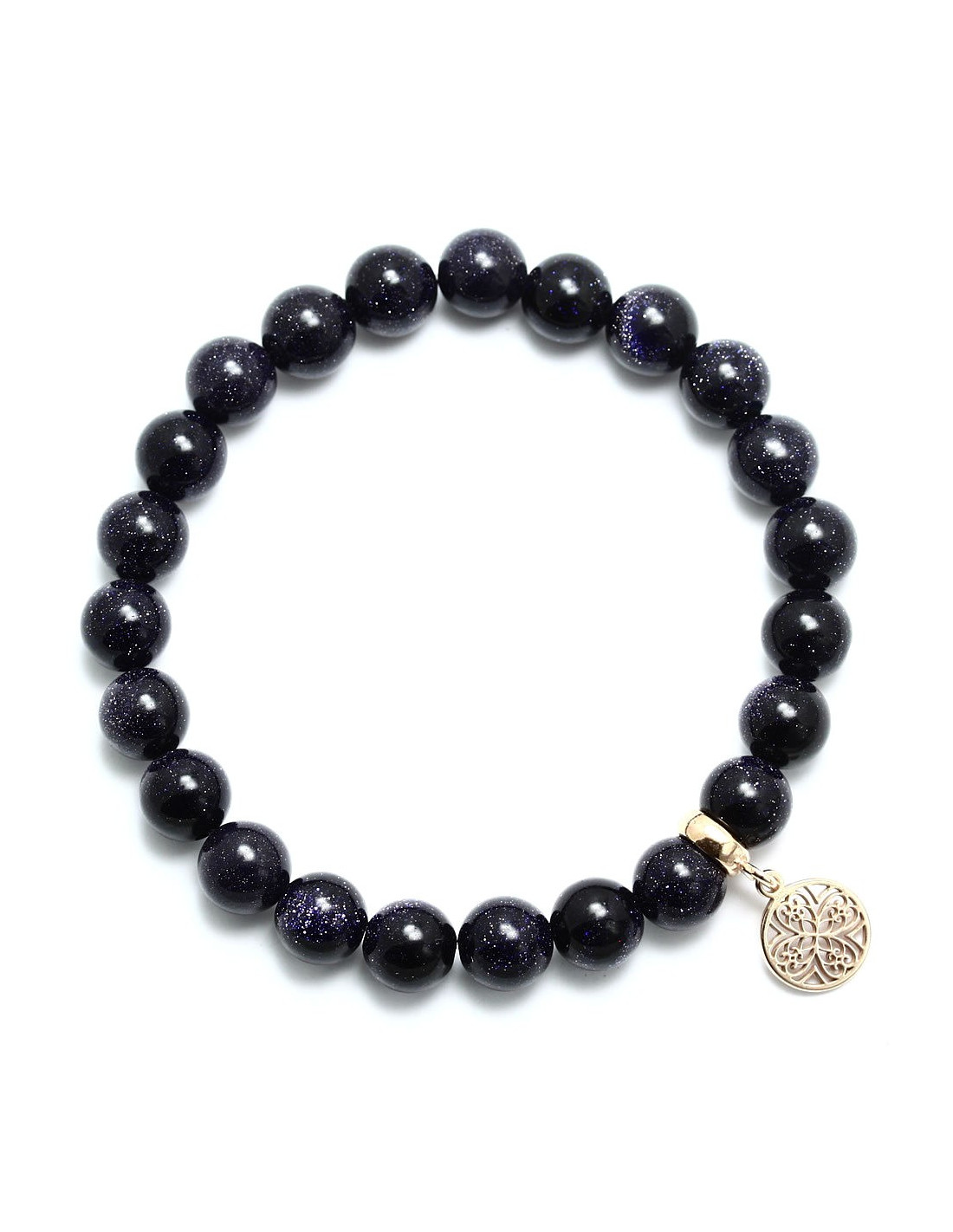 Bransoletka na elastycznej gumce jubilerskiej wykonana z kamienia o nazwie Noc Kairu oraz pozłacanej 24-karatowym złotem srebrnej rozety (dla uzyskania trwalszej powłoki element pokrywany jest 2 warstwami złota). Noc Kairu to granatowa odmiana szkła awenturynowego z charakterystycznym efektem skrzenia, za który odpowiadają drobinki innych metali, np. opiłki żelaza. Istnieje możliwość zamówienia innego rozmiaru niż podany w opisie.