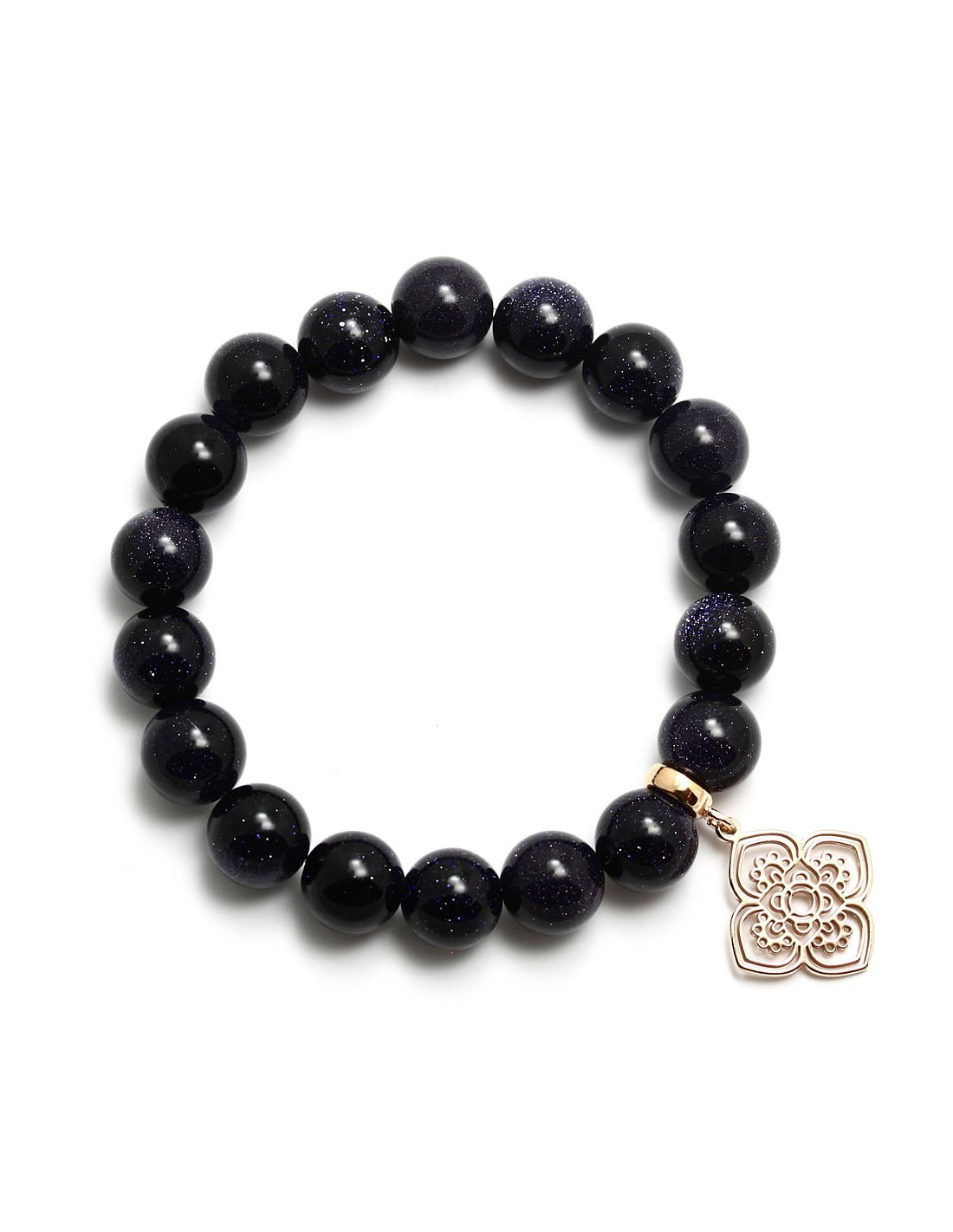 Bransoletka na elastycznej gumce jubilerskiej wykonana z kamienia o nazwie Noc Kairu oraz pozłacanej 24-karatowym różowym złotem srebrnej zawieszki w kształcie kwiatu lotosu - symbolu piękna, czystości i doskonałości. (dla uzyskania trwalszej powłoki element pokrywany jest 2 warstwami złota). Noc Kairu to granatowa odmiana szkła awenturynowego z charakterystycznym efektem skrzenia, za który odpowiadają drobinki innych metali, np. opiłki żelaza. Istnieje możliwość zamówienia innego rozmiaru niż podany w opisie.