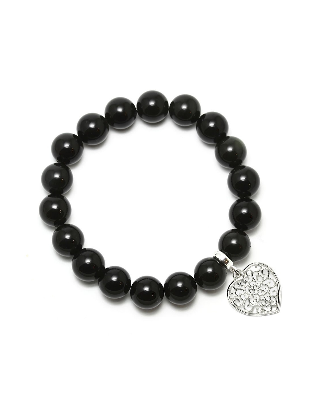 Bransoletka na elastycznej gumce jubilerskiej wykonana z czarnego onyksu oraz srebrnej, ażurowej zawieszki w kształcie serca - symbolu miłości, szczerości i oddania. Istnieje możliwość zamówienia innego rozmiaru niż podany w opisie.