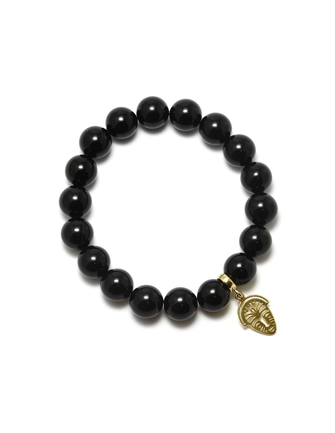Bransoletka na elastycznej gumce jubilerskiej wykonana z onyksu oraz pokrytej 24 karatowym złotem srebrnej zawieszki z motywem afrykańskiej maski. Istnieje możliwość zamówienia innego rozmiaru niż podany w opisie.